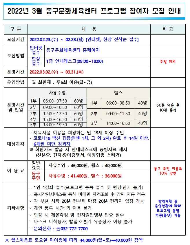2022년 3월 동구문화체육센터 프로그램 참여자 모집 안내 작성자 관리자 등록일자 2022년 2월 22일 15시 14분 33초 조회 242 20220222_154352.jpg [ Size : 398.58KB , Down : 903 ] 미리보기 다운로드 목록보기