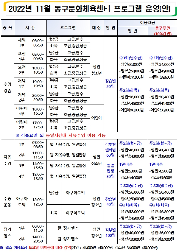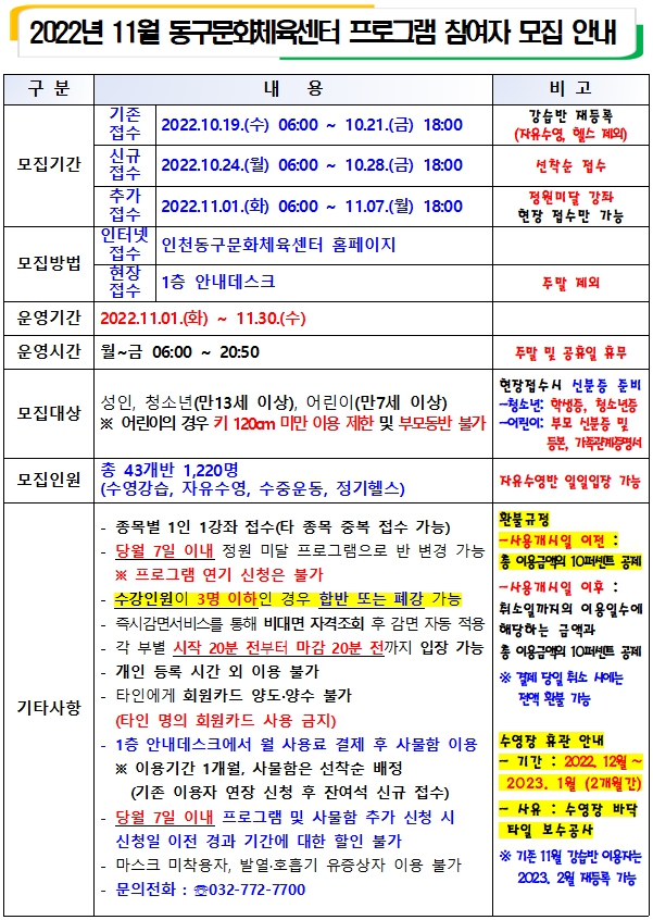 2022년 11월 동구문화체육센터 프로그램 참여자 모집 안내 작성자 관리자 등록일자 2022년 10월 19일 15시 3분 38초 조회 274 20221019_143929.jpg [ Size : 471.14KB , Down : 992 ] 미리보기 다운로드 20221019_143956.jpg [ Size : 451.15KB , Down : 1,010 ] 미리보기 다운로드 목록보기