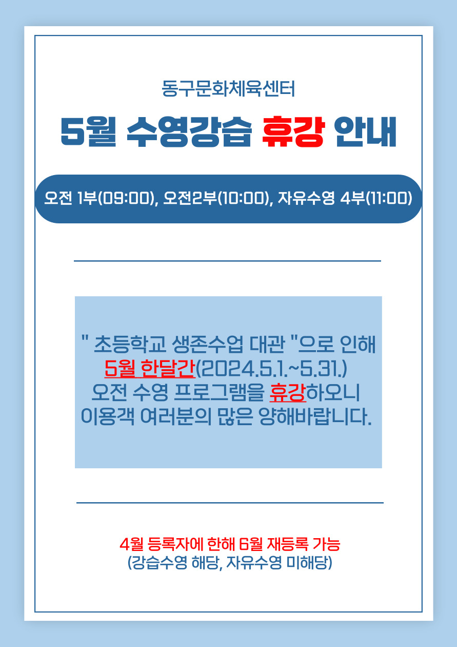 5월 수영강습 휴강 안내 작성자 관리자 등록일자 2024년 5월 13일 15시 35분 44초 조회 1,038 생존수업 휴강 안내.jpg [ Size : 187.66KB , Down : 1,235 ] 미리보기 다운로드 목록보기