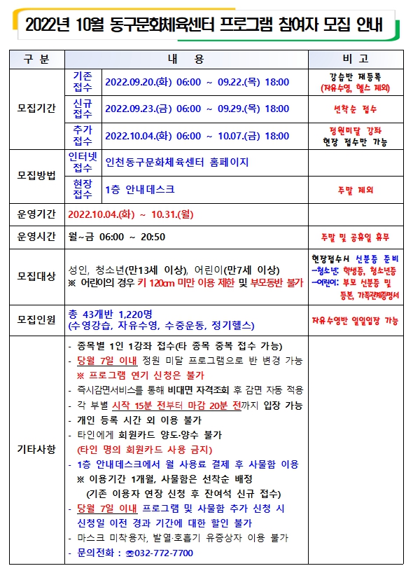 2022년 10월 동구문화체육센터 프로그램 참여자 모집 안내 작성자 관리자 등록일자 2022년 9월 19일 15시 7분 1초 조회 309 20220919_145114.jpg [ Size : 359.28KB , Down : 1,178 ] 미리보기 다운로드 20220919_145155.jpg [ Size : 409.5KB , Down : 1,154 ] 미리보기 다운로드 목록보기