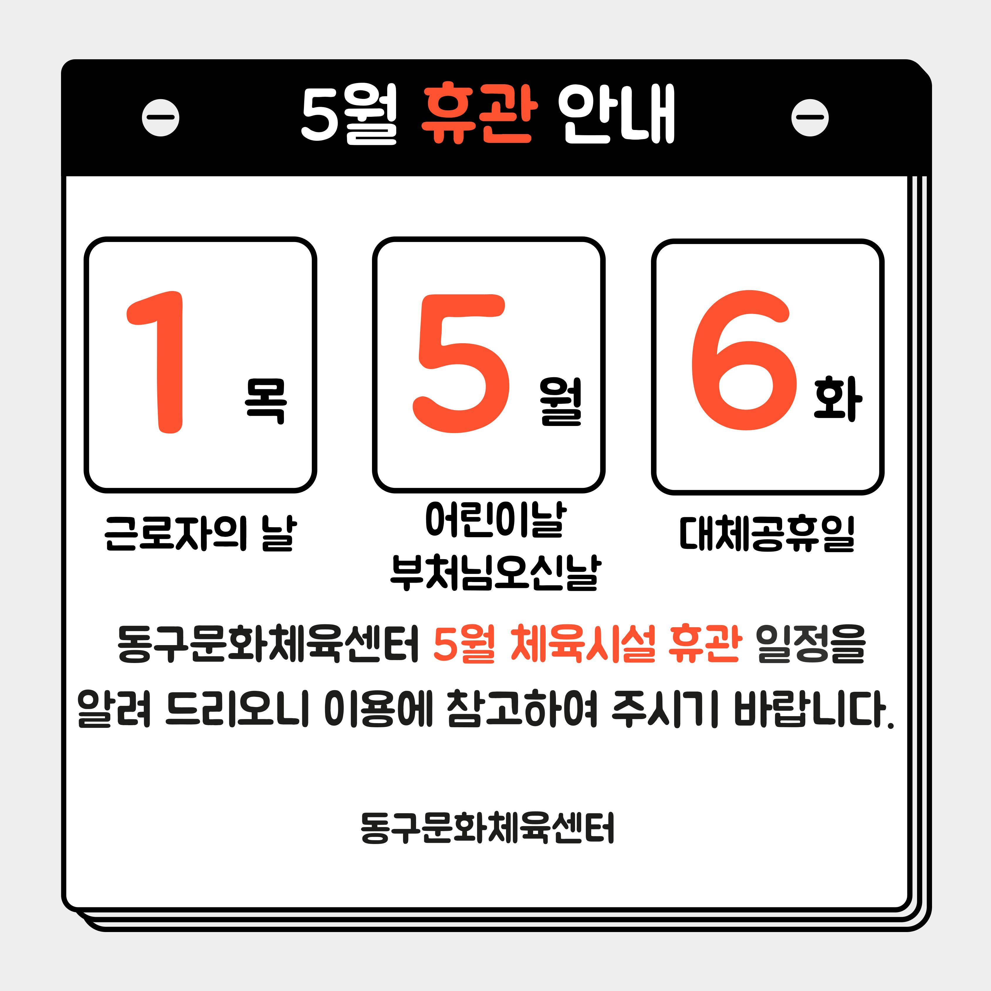 동구문화체육센터 5월 휴관 안내 작성자 관리자 등록일자 2025년 4월 14일 14시 45분 29초 조회 600 5월 휴관 안내.jpg [ Size : 596.64KB , Down : 537 ] 미리보기 다운로드 목록보기