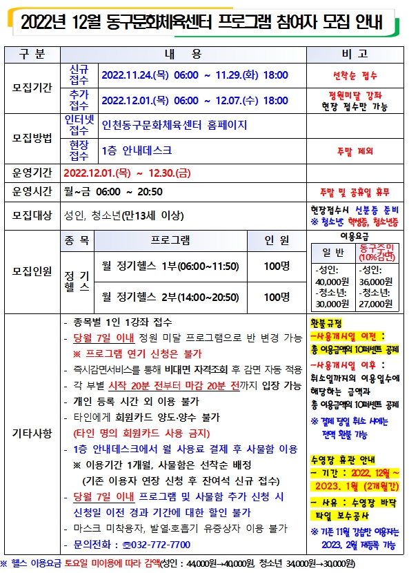2022년 12월 동구문화체육센터 프로그램 참여자 모집 안내 작성자 관리자 등록일자 2022년 11월 23일 14시 31분 31초 조회 237 20221123_142501.jpg [ Size : 447.68KB , Down : 694 ] 미리보기 다운로드 목록보기