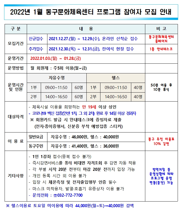 2022년 1월 동구문화체육센터 프로그램 참여자 모집 안내 작성자 관리자 등록일자 2021년 12월 24일 18시 20분 59초 조회 239 20211227_103825.jpg [ Size : 389.95KB , Down : 577 ] 미리보기 다운로드 목록보기
