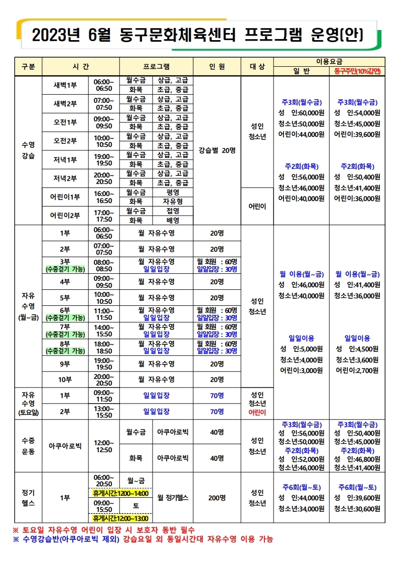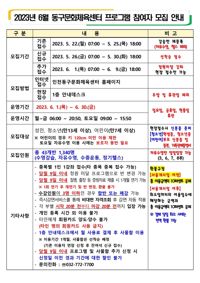 2023년 6월 동구문화체육센터 프로그램 참여자 모집안내 작성자 관리자 등록일자 2023년 5월 17일 16시 27분 50초 조회 1,708 2023. 6월 프로그램 모집 안내(문화체육센터).pdf_page_1.jpg [ Size : 575.67KB , Down : 2,579 ] 미리보기 다운로드 2023. 6월 프로그램 모집 안내(문화체육센터).pdf_page_2.jpg [ Size : 573.03KB , Down : 2,583 ] 미리보기 다운로드 목록보기