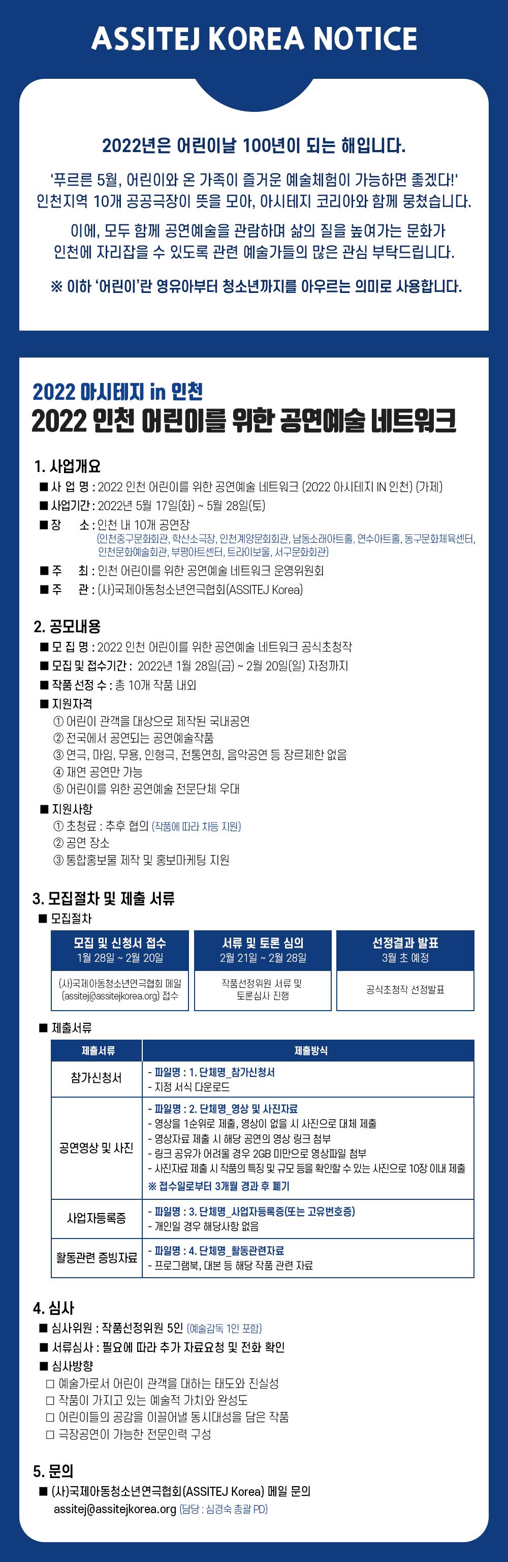 2022 인천 어린이를 위한 공연예술 네트워크(아시테지 IN 인천) 공식초청작 공모 작성자 관리자 등록일자 2022년 2월 8일 13시 33분 54초 조회 178 공모.jpg [ Size : 390.21KB , Down : 267 ] 미리보기 다운로드 목록보기