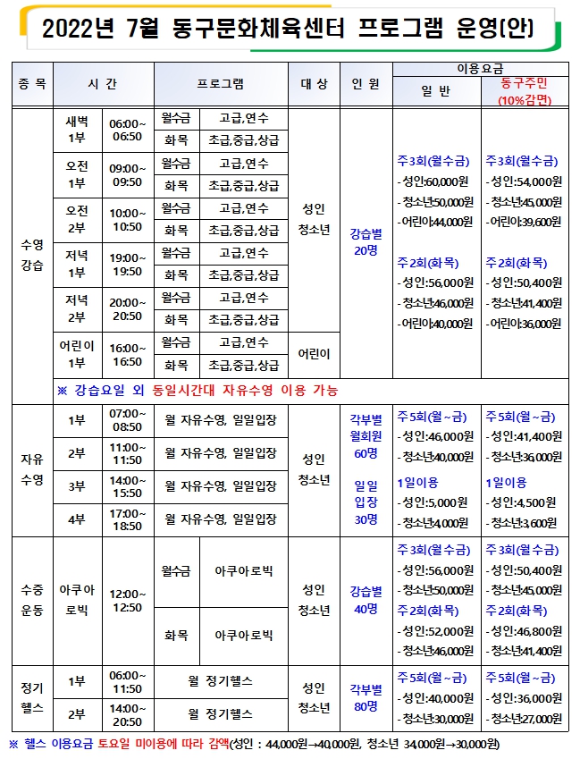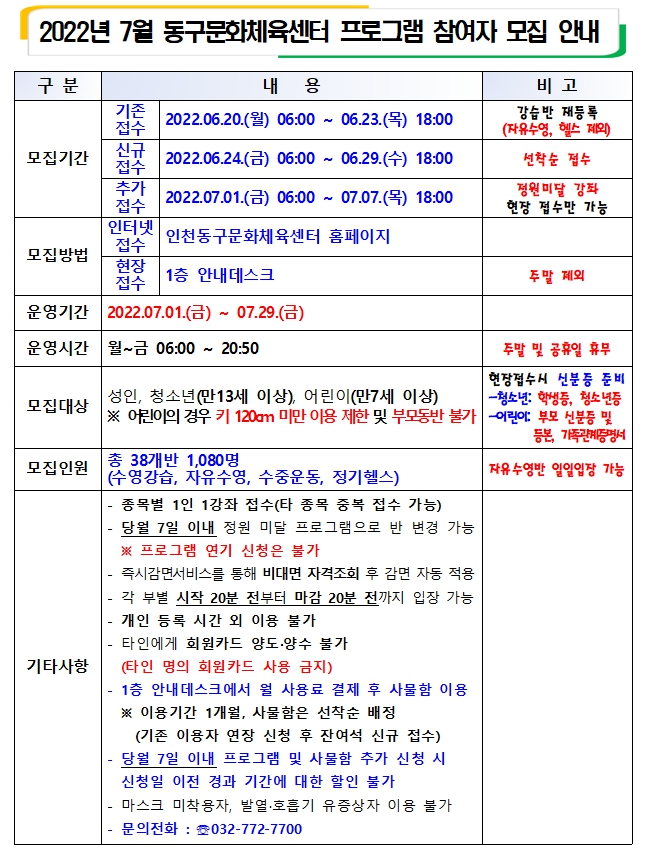 2022년 7월 동구문화체육센터 프로그램 참여자 모집 안내 작성자 관리자 등록일자 2022년 6월 16일 16시 51분 44초 조회 377 20220616_155010.jpg [ Size : 411.71KB , Down : 2,201 ] 미리보기 다운로드 20220616_155039.jpg [ Size : 456.48KB , Down : 2,168 ] 미리보기 다운로드 목록보기