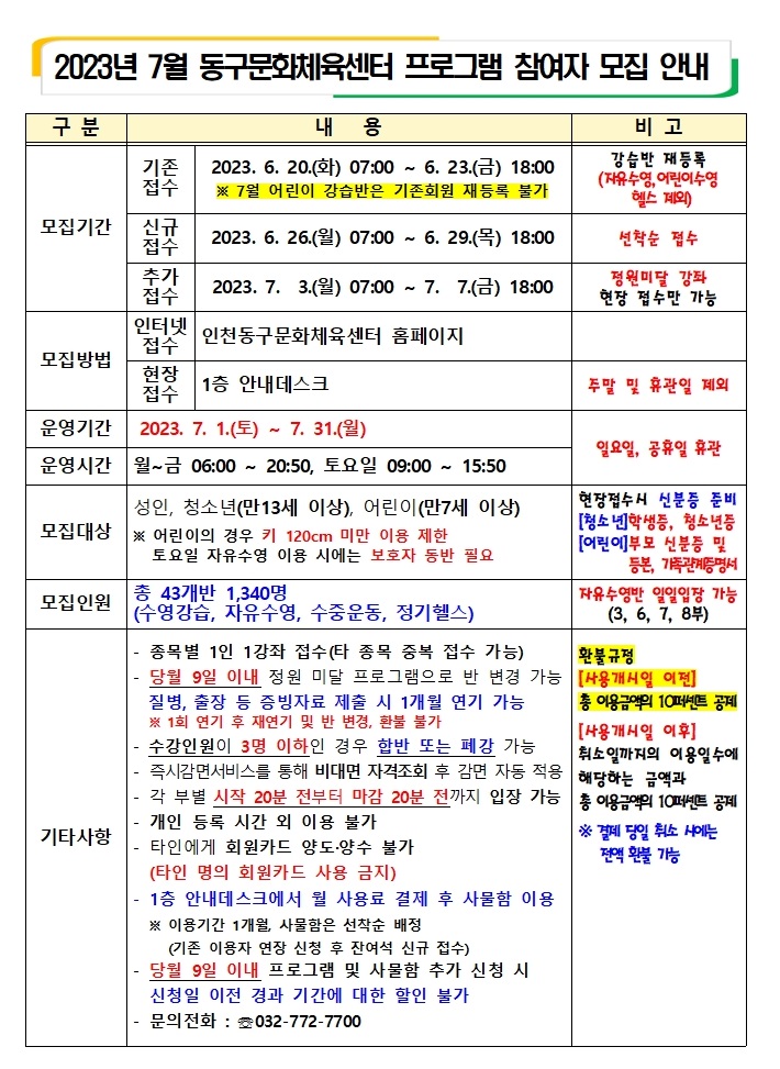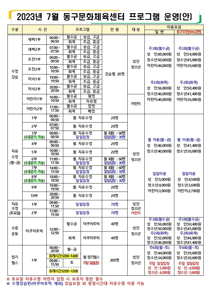 2023년 7월 동구문화체육센터 프로그램 참여자 모집 안내 작성자 관리자 등록일자 2023년 6월 19일 13시 46분 52초 조회 860 7월(1)001.jpg [ Size : 269.55KB , Down : 1,110 ] 미리보기 다운로드 7월(2)001001.jpg [ Size : 280.29KB , Down : 1,106 ] 미리보기 다운로드 목록보기