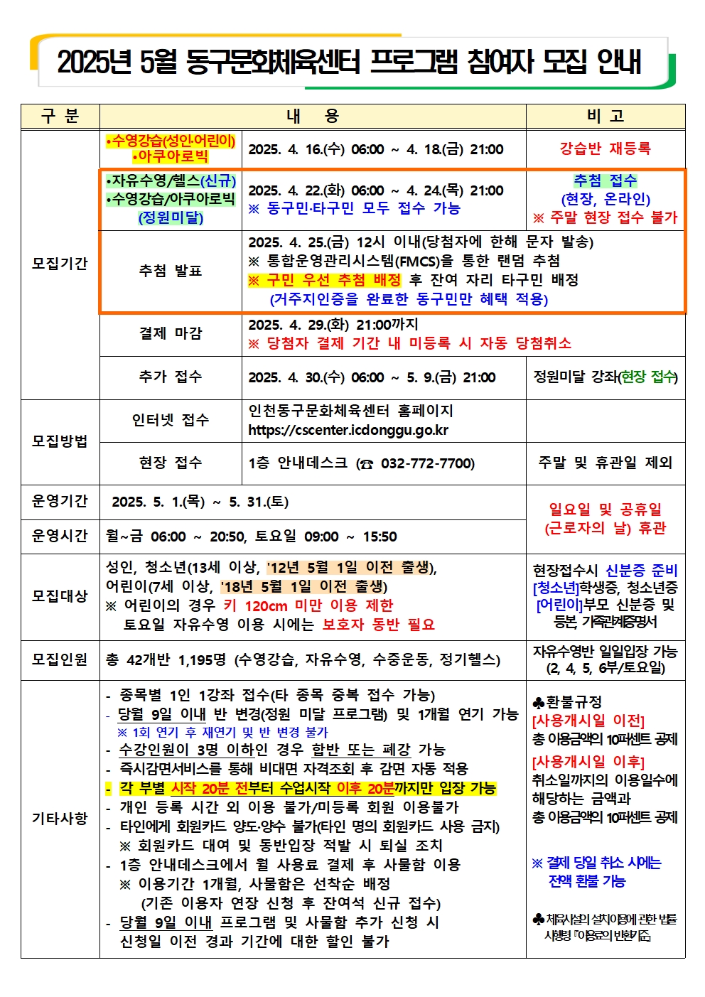 2025년 5월 동구문화체육센터 프로그램 참여자 모집 안내 작성자 관리자 등록일자 2024년 2월 16일 16시 32분 52초 조회 10,005 2025. 5월 프로그램 모집 안내001.jpg [ Size : 965.7KB , Down : 1,780 ] 미리보기 다운로드 2025. 5월 프로그램 모집 안내002.jpg [ Size : 782.29KB , Down : 1,756 ] 미리보기 다운로드 목록보기
