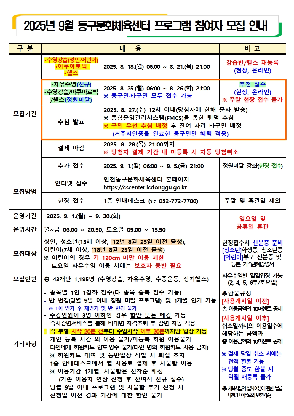 2025년 9월 동구문화체육센터 프로그램 참여자 모집 안내 작성자 관리자 등록일자 2025년 8월 13일 15시 3분 22초 조회 1,015 2025. 9월 프로그램 모집 안내001.jpg [ Size : 972.12KB , Down : 1,424 ] 미리보기 다운로드 2025. 9월 프로그램 모집 안내002.jpg [ Size : 789.35KB , Down : 1,374 ] 미리보기 다운로드 목록보기