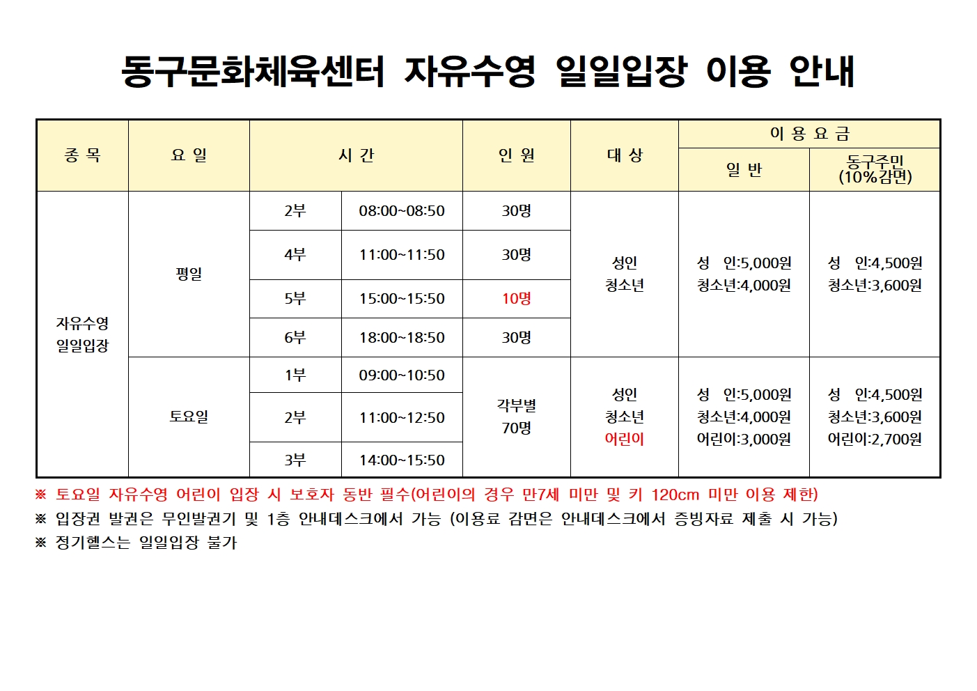 체육 [수영] Q. 자유수영 일일입장 시간은 어떻게 되나요? 작성자 관리자 작성일 2025년 10월 2일 16시 48분 47초 조회 333 동구문화체육센터 자유수영 일일입장 이용 안내(20251201)001.jpg [ Size : 391.68KB , Down : 130 ] 미리보기 다운로드 목록보기