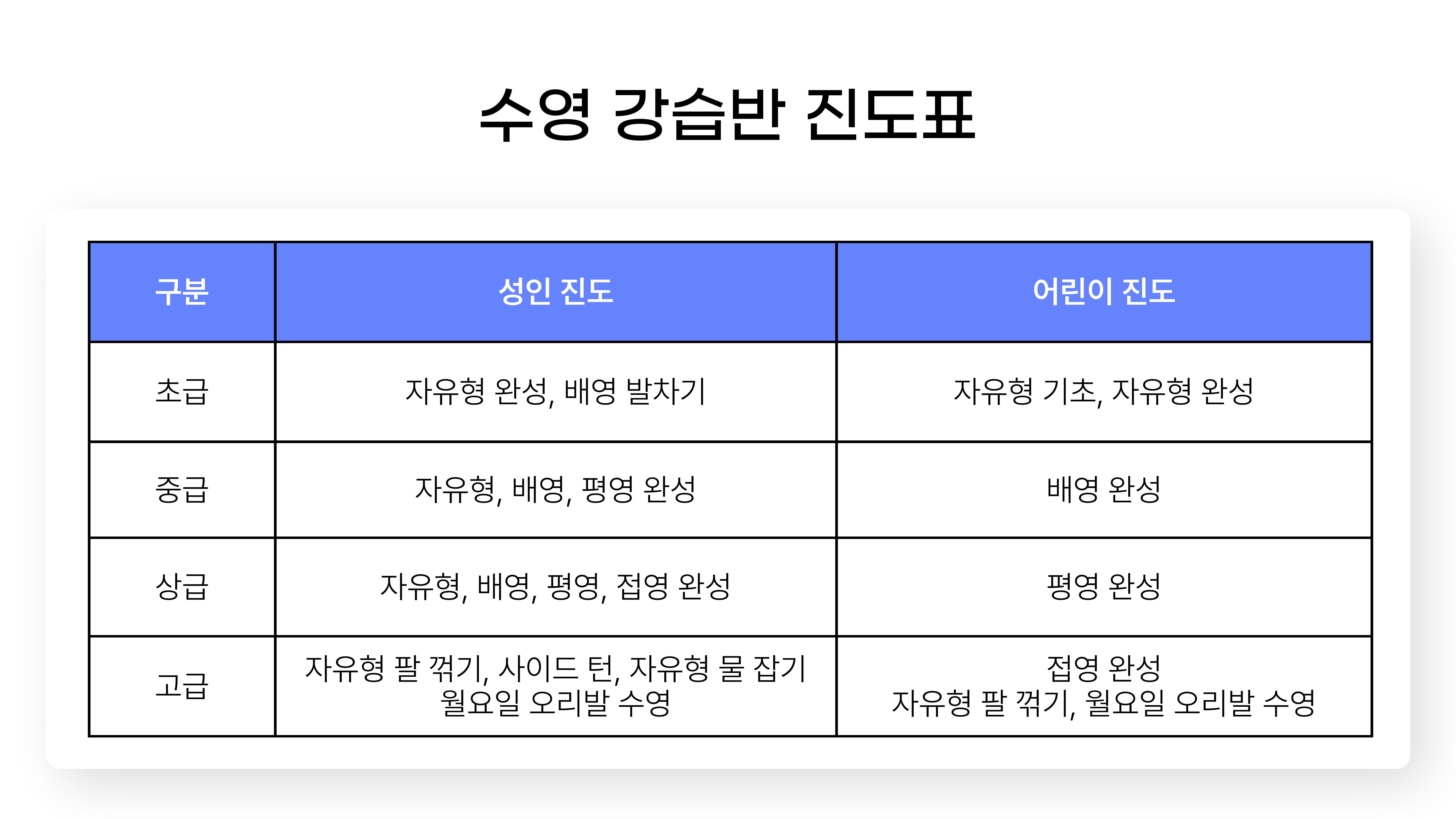 체육 [수영] Q. 수영 강습반 진도표가 궁금해요. 작성자 관리자 작성일 2025년 10월 2일 16시 49분 41초 조회 240 수영 강습반 진도표.jpg [ Size : 789.32KB , Down : 96 ] 미리보기 다운로드 목록보기