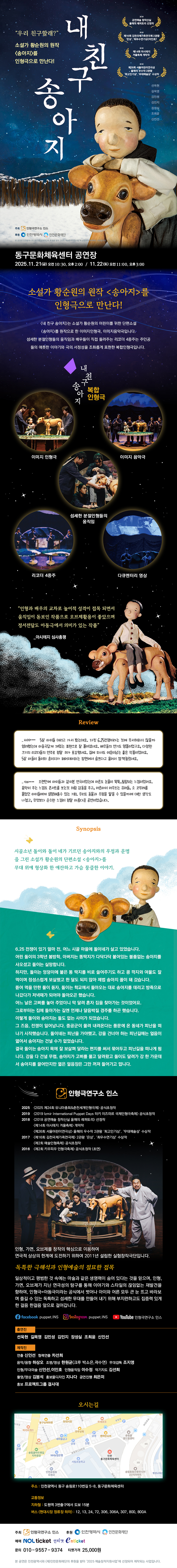 ■ 공연명 : 내 친구 송아지 ■ 일시: 2025. 11. 21.(금) 10:30, 14:00 ~11. 22.(토) 11:00, 15:00 ■ 장소 : 동구문화체육센터 공연장 ■ 관람연령 : 5세 이상 ■ 관람료 : 25,000원 ■ 주최 : 인형극연구소 인스 ■ 후원 : 인천광역시, (재)인천문화재단 ■ 예매: NOL티켓, 엔티켓 - 놀티켓 : https://tickets.interpark.com/goods/25015319 - 엔티켓 : https://www.enticket.com:469/pfm/sub01_view.html?pfmIng=1&p_idx=4006&p_cate=play ■ 문의: 010-9557-9374 (단체 10인 이상 별도 문의) |
